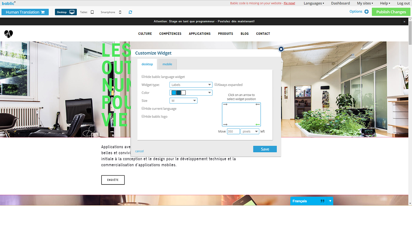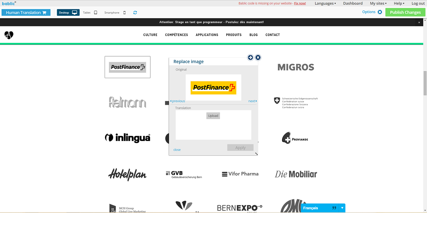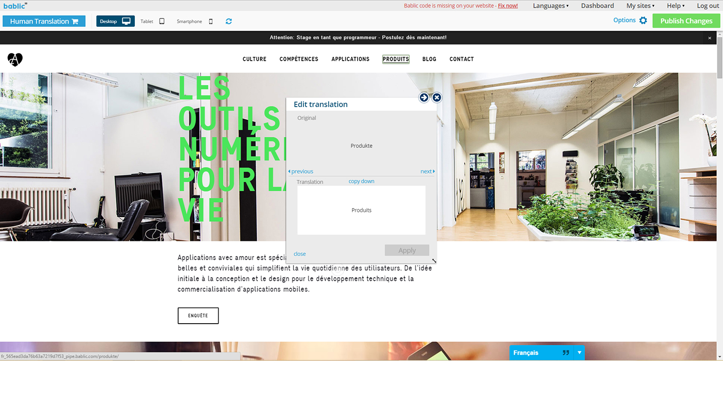 Free 1-on-1 consultations. Speak to any one of our dedicated localization experts for advice and more when entering a new market, free of charge. Dedicated support. All inquiries are answered within a matter of hours. Access to human translation. Get high-quality, professional, human translation from Bablic's network of translators, the same one used by industry leaders such as Google, IBM, Expedia and other Fortune 500 companies. Machine translation. Start off with machine translation and then manually improve it in order to save and even skip on ordering professional human translation if possible. Global delivery network. 99.9% uptime pretty much guarantees you won't miss a sale. Collaboration. Invite colleagues to help translate your website, assign them roles with limited access such as Translators, or even Admins with more freedom.Visit our homepage and just enter your URL for an instant preview of your translated website, for free, right now!